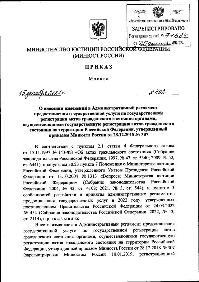 ПРИКАЗ Минюста РФ от 15.12.2022 N 402