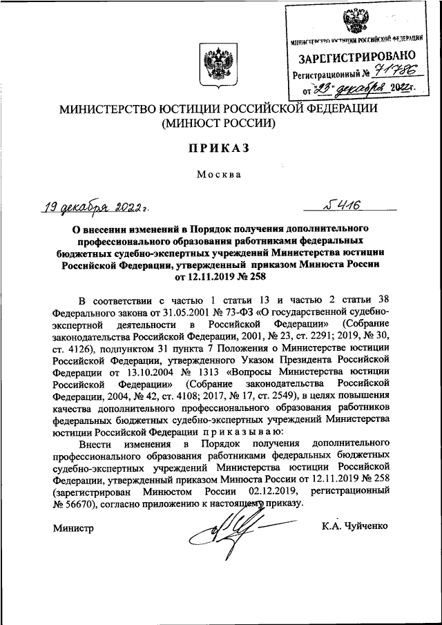 ПРИКАЗ Минюста РФ от 19.12.2022 N 416
