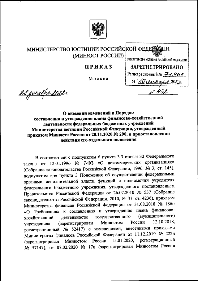ПРИКАЗ Минюста РФ от 28.12.2022 N 432
