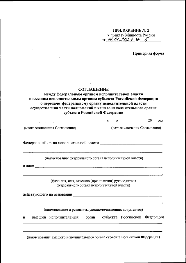 "ОБ УТВЕРЖДЕНИИ ПРИМЕРНЫХ ФОРМ СОГЛАШЕНИЯ МЕЖДУ ФЕДЕРАЛЬНЫМ ОРГАНОМ ИСПОЛНИТЕЛЬНОЙ ВЛАСТИ И ВЫСШИМ ИСПОЛНИТЕЛЬНЫМ ОРГАНОМ СУБЪЕКТА РОССИЙСКОЙ ФЕДЕРАЦИИ О ПЕРЕДАЧЕ ВЫСШЕМУ ИСПОЛНИТЕЛЬНОМУ ОРГАНУ СУБЪЕКТА РОССИЙСКОЙ ФЕДЕРАЦИИ ОСУЩЕСТВЛЕНИЯ ЧАСТИ ПОЛНОМОЧИЙ ФЕДЕРАЛЬНОГО ОРГАНА ИСПОЛНИТЕЛЬНОЙ ВЛАСТИ, СОГЛАШЕНИЯ МЕЖДУ ФЕДЕРАЛЬНЫМ ОРГАНОМ ИСПОЛНИТЕЛЬНОЙ ВЛАСТИ И ВЫСШИМ ИСПОЛНИТЕЛЬНЫМ ОРГАНОМ СУБЪЕКТА РОССИЙСКОЙ ФЕДЕРАЦИИ О ПЕРЕДАЧЕ ФЕДЕРАЛЬНОМУ ОРГАНУ ИСПОЛНИТЕЛЬНОЙ ВЛАСТИ ОСУЩЕСТВЛЕНИЯ ЧАСТИ ПОЛНОМОЧИЙ ВЫСШЕГО ИСПОЛНИТЕЛЬНОГО ОРГАНА СУБЪЕКТА РОССИЙСКОЙ ФЕДЕРАЦИИ"