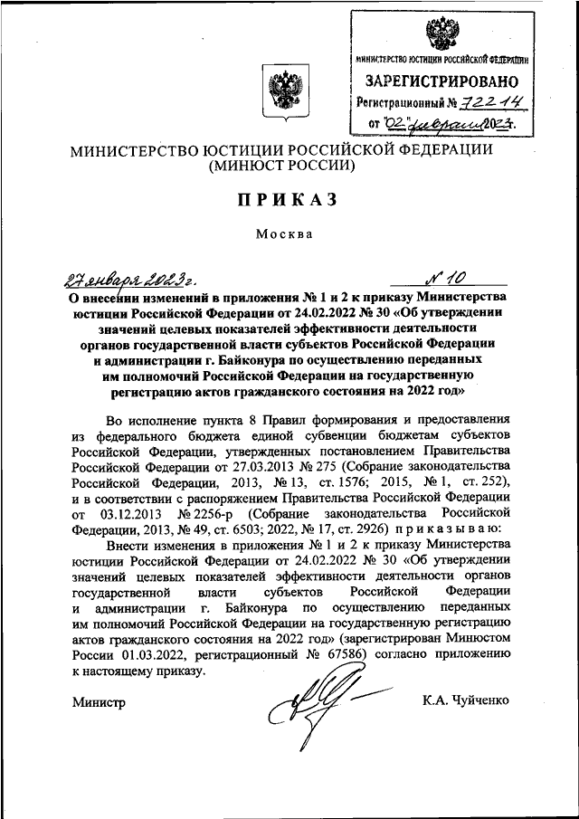 ЮСТИЦИИ РОССИЙСКОЙ ФЕДЕРАЦИИ ОТ 24.02.2022 N 30 "ОБ УТВЕРЖДЕНИИ