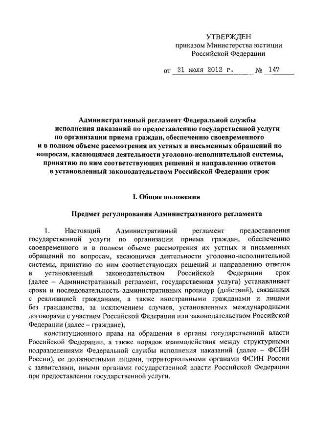 ПРИКАЗ Минюста РФ от 31.07.2012 N 147