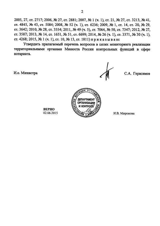 "ОБ УТВЕРЖДЕНИИ ПЕРЕЧНЯ ВОПРОСОВ В ЦЕЛЯХ МОНИТОРИНГА РЕАЛИЗАЦИИ ТЕРРИТОРИАЛЬНЫМИ ОРГАНАМИ МИНЮСТА РОССИИ КОНТРОЛЬНЫХ ФУНКЦИЙ В СФЕРЕ НОТАРИАТА"