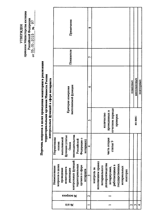 "ОБ УТВЕРЖДЕНИИ ПЕРЕЧНЯ ВОПРОСОВ В ЦЕЛЯХ МОНИТОРИНГА РЕАЛИЗАЦИИ ТЕРРИТОРИАЛЬНЫМИ ОРГАНАМИ МИНЮСТА РОССИИ КОНТРОЛЬНЫХ ФУНКЦИЙ В СФЕРЕ НОТАРИАТА"