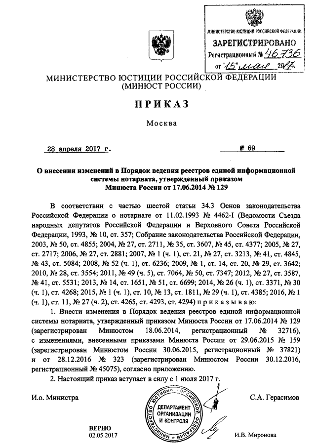 ПРИКАЗ Минюста РФ от 28.04.2017 N 69