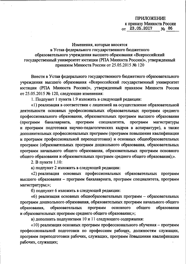 ПРИКАЗ Минюста РФ от 23.05.2017 N 86