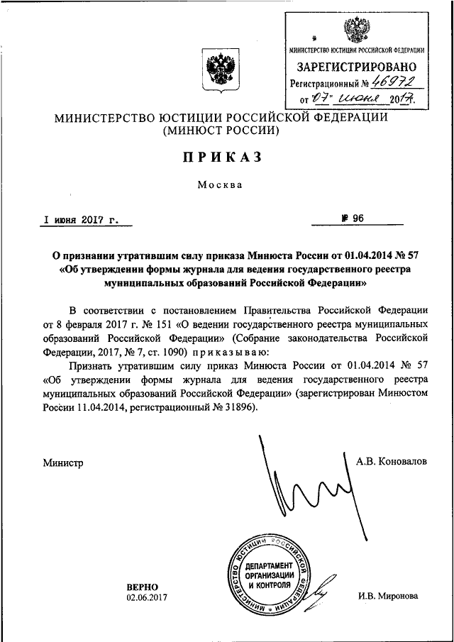 ПРИКАЗ Минюста РФ от 01.06.2017 N 96