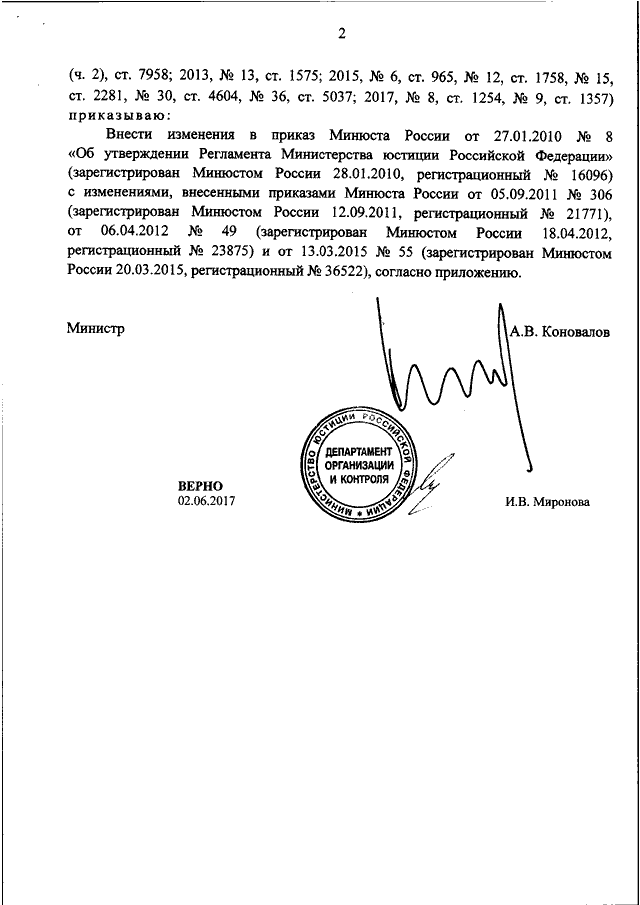 "О ВНЕСЕНИИ ИЗМЕНЕНИЙ В ПРИКАЗ МИНЮСТА РОССИИ ОТ 27.01.2010 N 8 "ОБ УТВЕРЖДЕНИИ РЕГЛАМЕНТА МИНИСТЕРСТВА ЮСТИЦИИ РОССИЙСКОЙ ФЕДЕРАЦИИ"