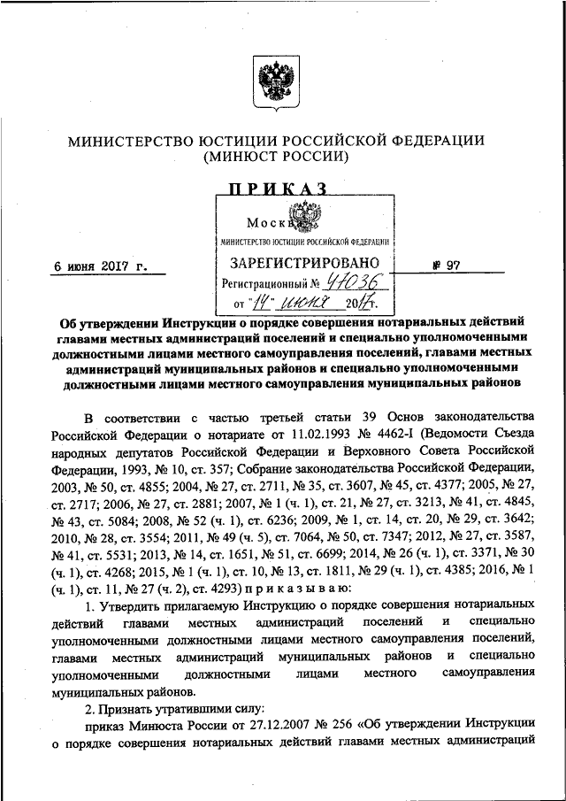 ПРИКАЗ Минюста РФ от 06.06.2017 N 97