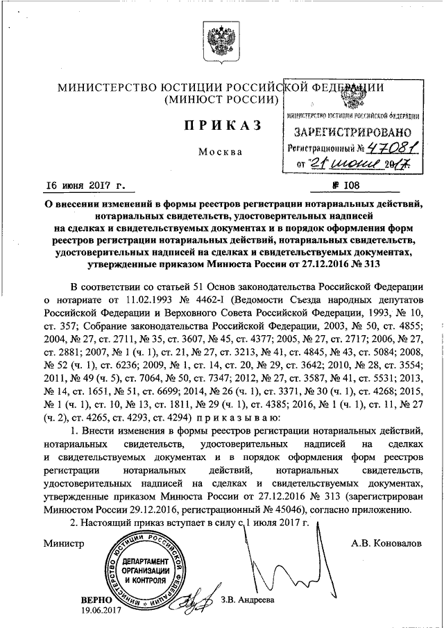 ПРИКАЗ Минюста РФ от 16.06.2017 N 108