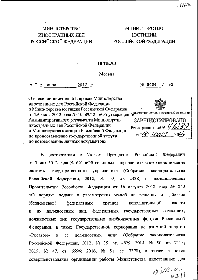 ПРИКАЗ МИД РФ N 9404, Минюста РФ N 93 от 01.06.2017