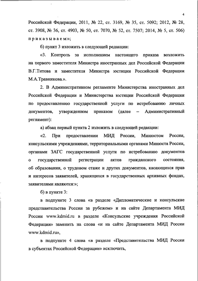 "О ВНЕСЕНИИ ИЗМЕНЕНИЙ В ПРИКАЗ МИНИСТЕРСТВА ИНОСТРАННЫХ ДЕЛ РОССИЙСКОЙ ФЕДЕРАЦИИ И МИНИСТЕРСТВА ЮСТИЦИИ РОССИЙСКОЙ ФЕДЕРАЦИИ ОТ 29 ИЮНЯ 2012 Г. N 10489/124 "ОБ УТВЕРЖДЕНИИ АДМИНИСТРАТИВНОГО РЕГЛАМЕНТА МИНИСТЕРСТВА ИНОСТРАННЫХ ДЕЛ РОССИЙСКОЙ ФЕДЕРАЦИИ И МИНИСТЕРСТВА ЮСТИЦИИ РОССИЙСКОЙ ФЕДЕРАЦИИ ПО ПРЕДОСТАВЛЕНИЮ ГОСУДАРСТВЕННОЙ УСЛУГИ ПО ИСТРЕБОВАНИЮ ЛИЧНЫХ ДОКУМЕНТОВ"