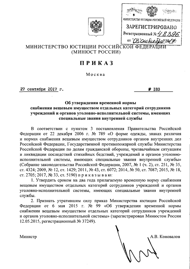 ПРИКАЗ Минюста РФ от 27.09.2017 N 183