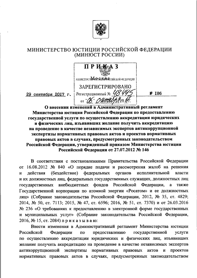 ПРИКАЗ Минюста РФ от 29.09.2017 N 186