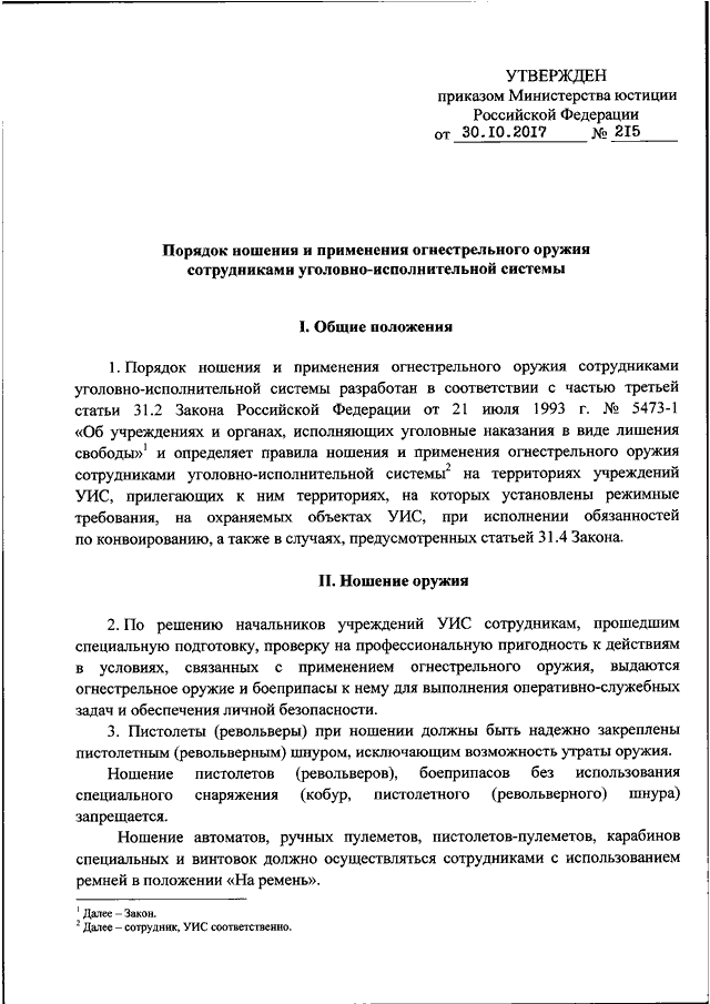 "ОБ УТВЕРЖДЕНИИ ПОРЯДКА НОШЕНИЯ И ПРИМЕНЕНИЯ ОГНЕСТРЕЛЬНОГО ОРУЖИЯ СОТРУДНИКАМИ УГОЛОВНО - ИСПОЛНИТЕЛЬНОЙ СИСТЕМЫ"