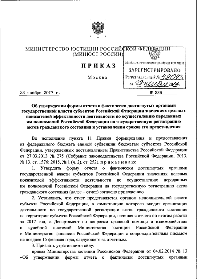 ПРИКАЗ Минюста РФ от 23.11.2017 N 236