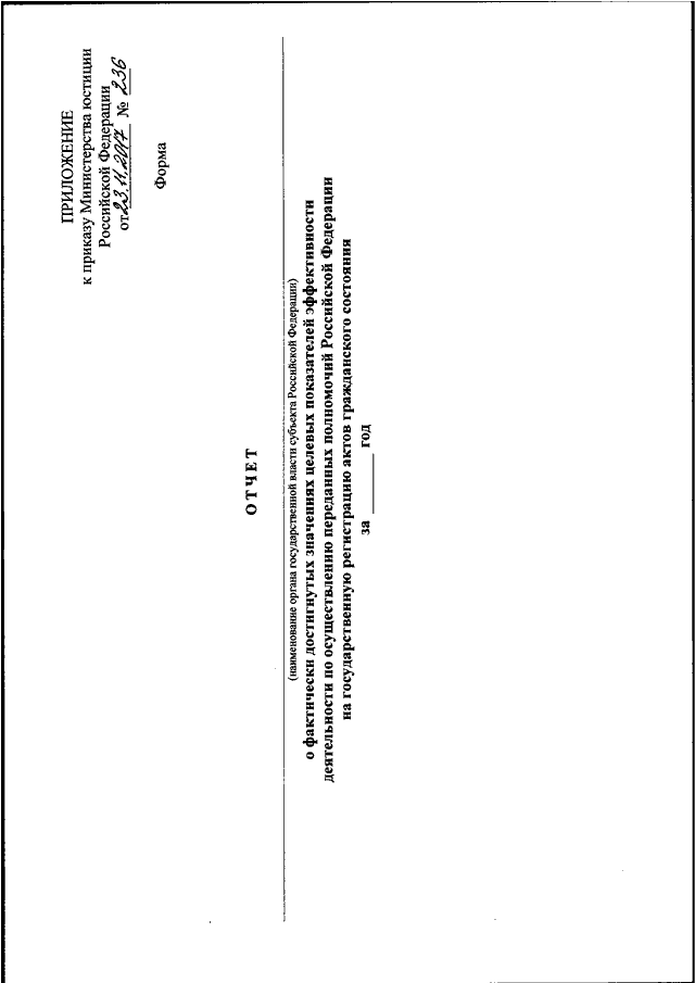 "ОБ УТВЕРЖДЕНИИ ФОРМЫ ОТЧЕТА О ФАКТИЧЕСКИ ДОСТИГНУТЫХ ОРГАНАМИ ГОСУДАРСТВЕННОЙ ВЛАСТИ СУБЪЕКТОВ РОССИЙСКОЙ ФЕДЕРАЦИИ ЗНАЧЕНИЯХ ЦЕЛЕВЫХ ПОКАЗАТЕЛЕЙ ЭФФЕКТИВНОСТИ ДЕЯТЕЛЬНОСТИ ПО ОСУЩЕСТВЛЕНИЮ ПЕРЕДАННЫХ ИМ ПОЛНОМОЧИЙ РОССИЙСКОЙ ФЕДЕРАЦИИ НА ГОСУДАРСТВЕННУЮ РЕГИСТРАЦИЮ АКТОВ ГРАЖДАНСКОГО СОСТОЯНИЯ И УСТАНОВЛЕНИИ СРОКОВ ЕГО ПРЕДСТАВЛЕНИЯ"