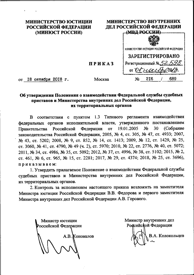 ПРИКАЗ Минюста РФ N 216, МВД РФ N 689 от 18.10.2018