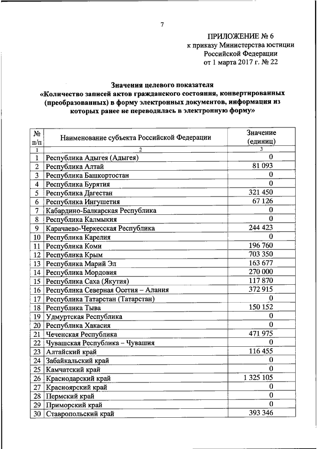 "О ВНЕСЕНИИ ИЗМЕНЕНИЙ В ПРИКАЗ МИНИСТЕРСТВА ЮСТИЦИИ РОССИЙСКОЙ ФЕДЕРАЦИИ ОТ 01.03.2017 N 22 "ОБ УТВЕРЖДЕНИИ ЗНАЧЕНИЙ ЦЕЛЕВЫХ ПОКАЗАТЕЛЕЙ ЭФФЕКТИВНОСТИ ДЕЯТЕЛЬНОСТИ ОРГАНОВ ГОСУДАРСТВЕННОЙ ВЛАСТИ СУБЪЕКТОВ РОССИЙСКОЙ ФЕДЕРАЦИИ ПО ОСУЩЕСТВЛЕНИЮ ПЕРЕДАННЫХ ИМ ПОЛНОМОЧИЙ РОССИЙСКОЙ ФЕДЕРАЦИИ НА ГОСУДАРСТВЕННУЮ РЕГИСТРАЦИЮ АКТОВ ГРАЖДАНСКОГО СОСТОЯНИЯ НА 2017 ГОД"