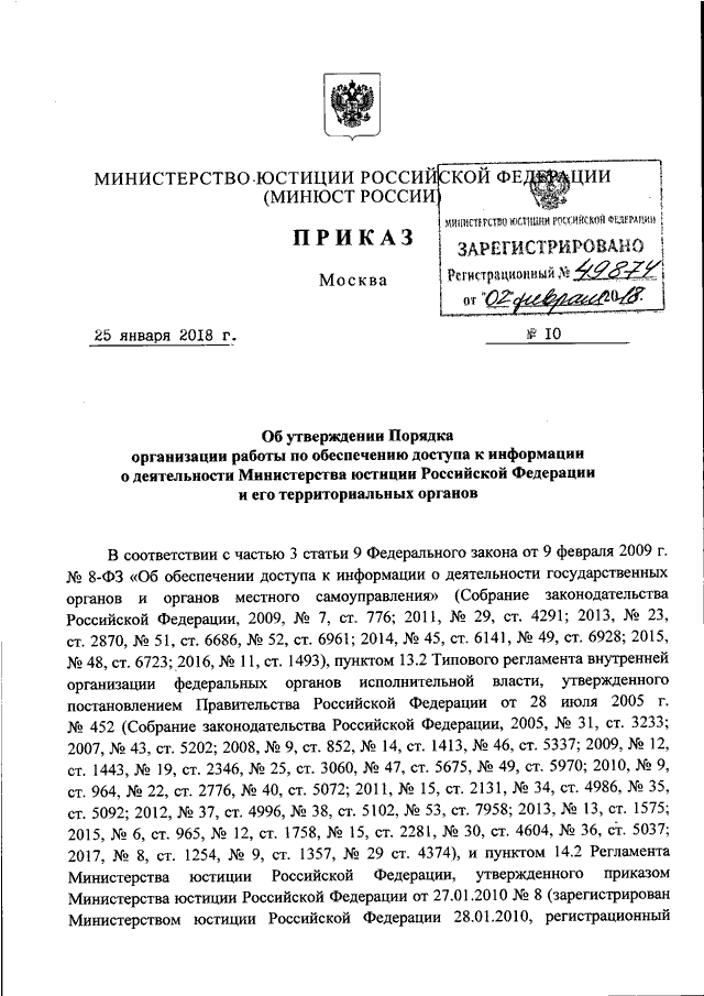 ПРИКАЗ Минюста РФ от 25.01.2018 N 10