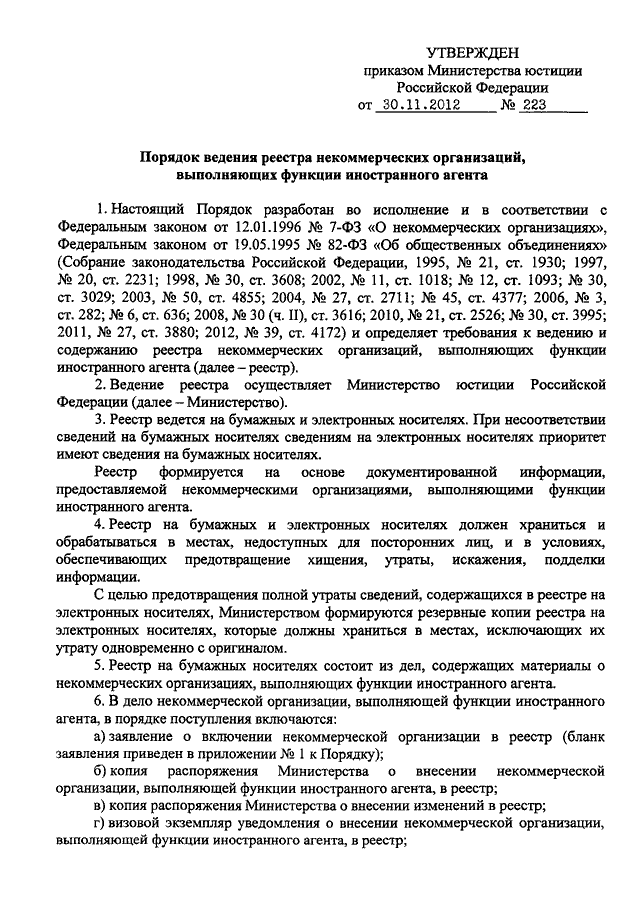 "О ПОРЯДКЕ ВЕДЕНИЯ РЕЕСТРА НЕКОММЕРЧЕСКИХ ОРГАНИЗАЦИЙ, ВЫПОЛНЯЮЩИХ ФУНКЦИИ ИНОСТРАННОГО АГЕНТА"