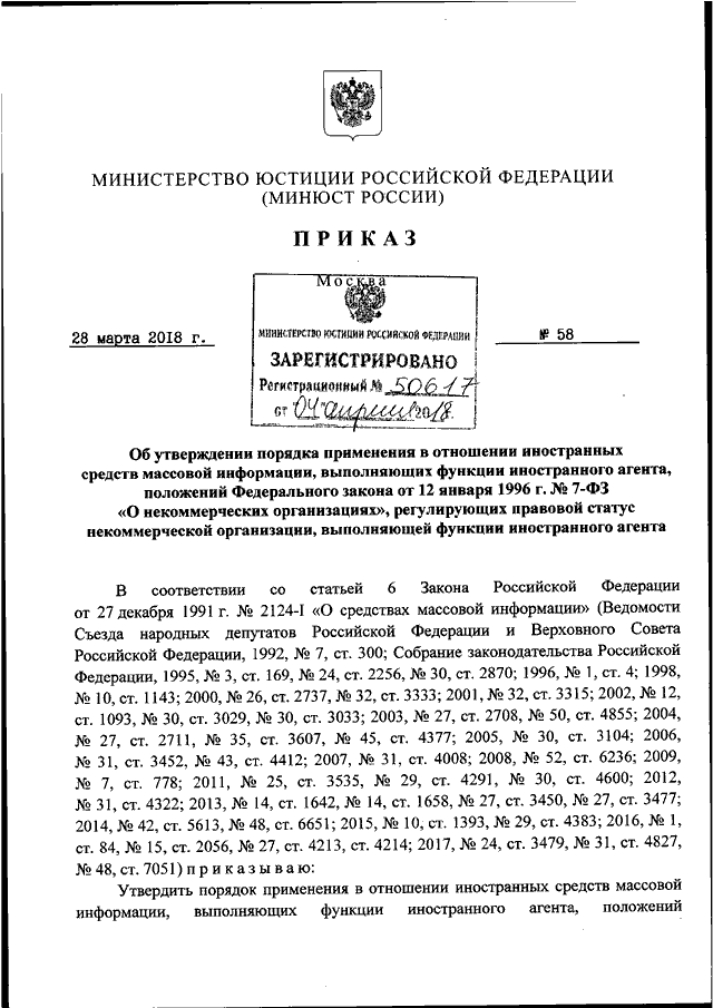 ПРИКАЗ Минюста РФ от 28.03.2018 N 58