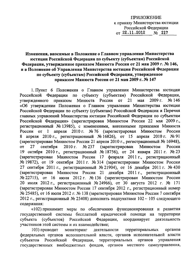 "О ВНЕСЕНИИ ИЗМЕНЕНИЙ В ПОЛОЖЕНИЕ О ГЛАВНОМ УПРАВЛЕНИИ МИНИСТЕРСТВА ЮСТИЦИИ РОССИЙСКОЙ ФЕДЕРАЦИИ ПО СУБЪЕКТУ (СУБЪЕКТАМ) РОССИЙСКОЙ ФЕДЕРАЦИИ, УТВЕРЖДЕННОЕ ПРИКАЗОМ МИНЮСТА РОССИИ ОТ 21 МАЯ 2009 Г. N 146, И В ПОЛОЖЕНИЕ ОБ УПРАВЛЕНИИ МИНИСТЕРСТВА ЮСТИЦИИ РОССИЙСКОЙ ФЕДЕРАЦИИ ПО СУБЪЕКТУ (СУБЪЕКТАМ) РОССИЙСКОЙ ФЕДЕРАЦИИ, УТВЕРЖДЕННОЕ ПРИКАЗОМ МИНЮСТА РОССИИ ОТ 21 МАЯ 2009 Г. N 147"