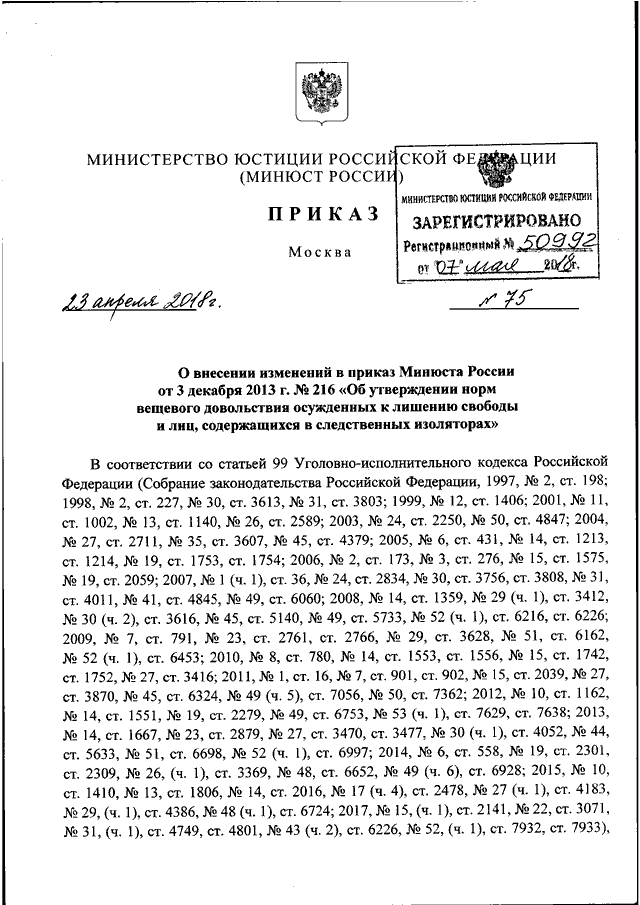 ПРИКАЗ Минюста РФ от 23.04.2018 N 75