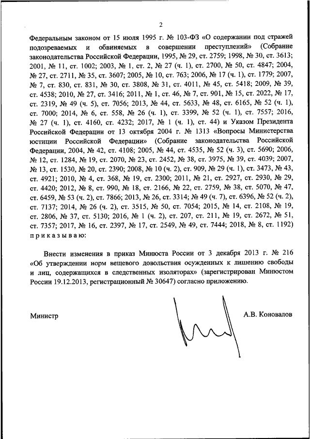 "О ВНЕСЕНИИ ИЗМЕНЕНИЙ В ПРИКАЗ МИНЮСТА РОССИИ ОТ 3 ДЕКАБРЯ 2013 Г. N 216 "ОБ УТВЕРЖДЕНИИ НОРМ ВЕЩЕВОГО ДОВОЛЬСТВИЯ ОСУЖДЕННЫХ К ЛИШЕНИЮ СВОБОДЫ И ЛИЦ, СОДЕРЖАЩИХСЯ В СЛЕДСТВЕННЫХ ИЗОЛЯТОРАХ"