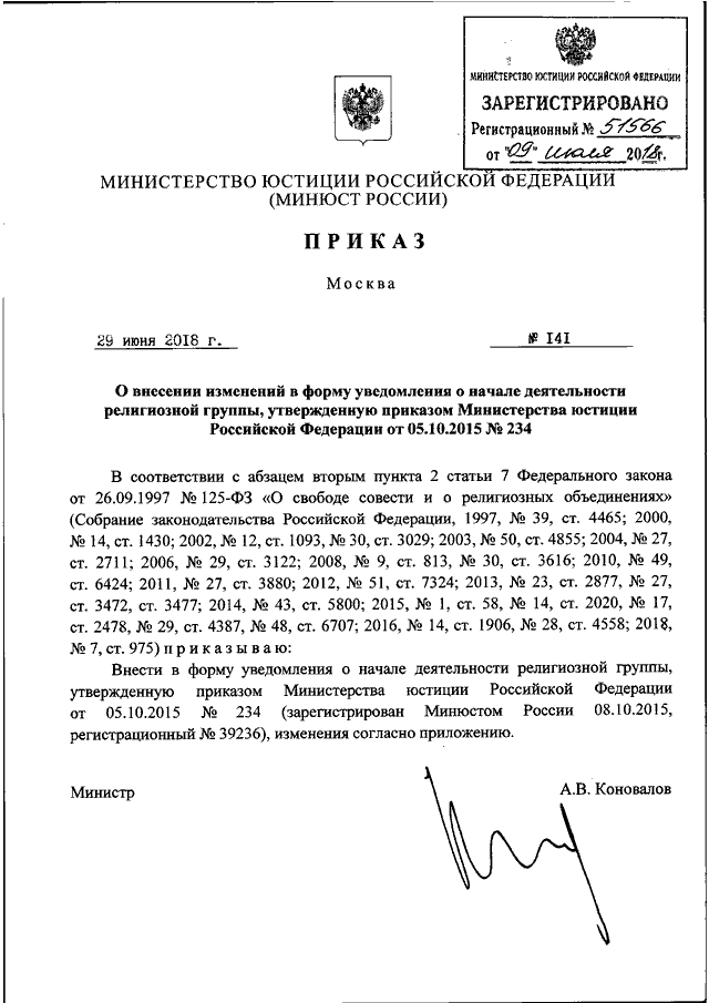 ПРИКАЗ Минюста РФ от 29.06.2018 N 141