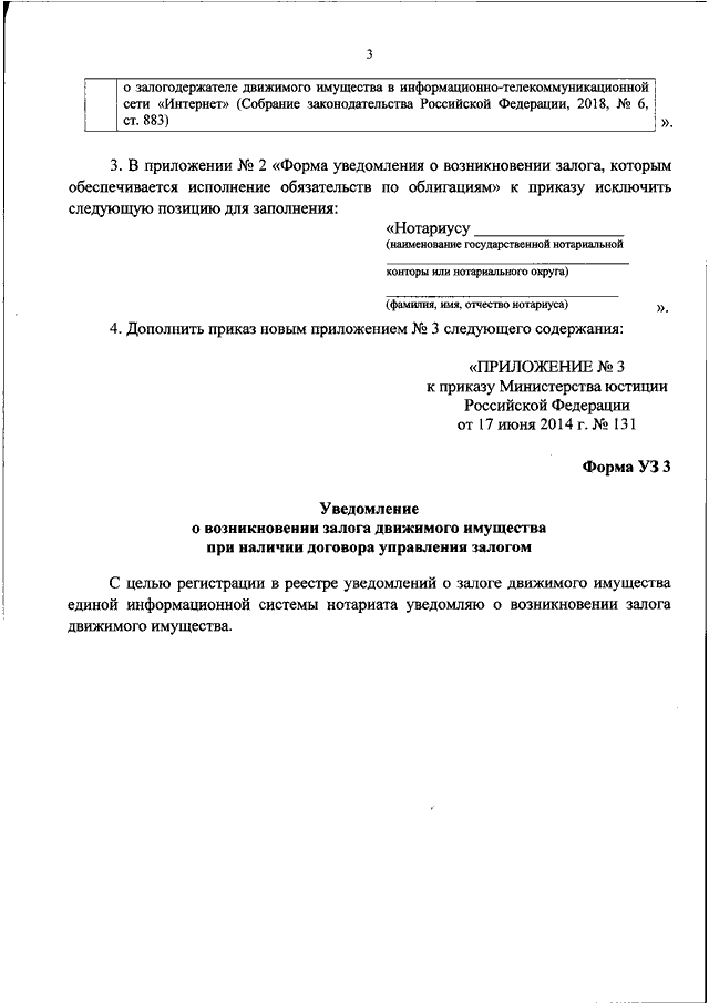 "О ВНЕСЕНИИ ИЗМЕНЕНИЙ В ПРИКАЗ МИНИСТЕРСТВА ЮСТИЦИИ РОССИЙСКОЙ ФЕДЕРАЦИИ ОТ 17.06.2014 N 131 "ОБ УТВЕРЖДЕНИИ ФОРМ УВЕДОМЛЕНИЙ О ЗАЛОГЕ ДВИЖИМОГО ИМУЩЕСТВА"