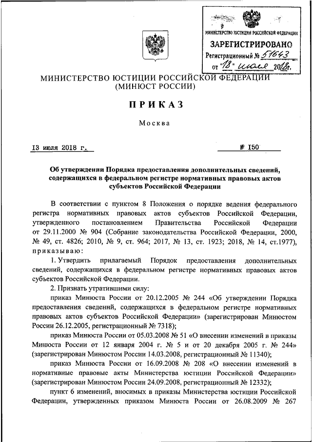 ПРИКАЗ Минюста РФ от 13.07.2018 N 150