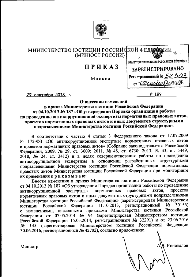 ПРИКАЗ Минюста РФ от 27.09.2018 N 197