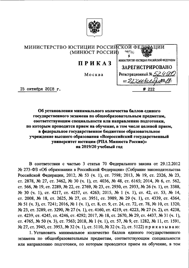ПРИКАЗ Минюста РФ от 15.10.2018 N 212