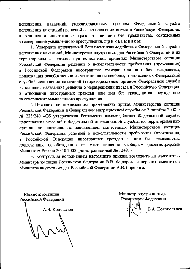 "ОБ УТВЕРЖДЕНИИ РЕГЛАМЕНТА ВЗАИМОДЕЙСТВИЯ ФЕДЕРАЛЬНОЙ СЛУЖБЫ ИСПОЛНЕНИЯ НАКАЗАНИЙ, МИНИСТЕРСТВА ВНУТРЕННИХ ДЕЛ РОССИЙСКОЙ ФЕДЕРАЦИИ И ИХ ТЕРРИТОРИАЛЬНЫХ ОРГАНОВ ПРИ ИСПОЛНЕНИИ ПРИНЯТЫХ МИНИСТЕРСТВОМ ЮСТИЦИИ РОССИЙСКОЙ ФЕДЕРАЦИИ РЕШЕНИЙ О НЕЖЕЛАТЕЛЬНОСТИ ПРЕБЫВАНИЯ (ПРОЖИВАНИЯ) В РОССИЙСКОЙ ФЕДЕРАЦИИ ИНОСТРАННЫХ ГРАЖДАН ИЛИ ЛИЦ БЕЗ ГРАЖДАНСТВА, ПОДЛЕЖАЩИХ ОСВОБОЖДЕНИЮ ИЗ МЕСТ ЛИШЕНИЯ СВОБОДЫ, И ВЫНЕСЕННЫХ ФЕДЕРАЛЬНОЙ СЛУЖБОЙ ИСПОЛНЕНИЯ НАКАЗАНИЙ (ТЕРРИТОРИАЛЬНЫМ ОРГАНОМ ФЕДЕРАЛЬНОЙ СЛУЖБЫ ИСПОЛНЕНИЯ НАКАЗАНИЙ) РЕШЕНИЙ О НЕРАЗРЕШЕНИИ ВЪЕЗДА В РОССИЙСКУЮ ФЕДЕРАЦИЮ В ОТНОШЕНИИ ИНОСТРАННЫХ ГРАЖДАН ИЛИ ЛИЦ БЕЗ ГРАЖДАНСТВА, ОСУЖДЕННЫХ ЗА СОВЕРШЕНИЕ УМЫШЛЕННОГО ПРЕСТУПЛЕНИЯ"