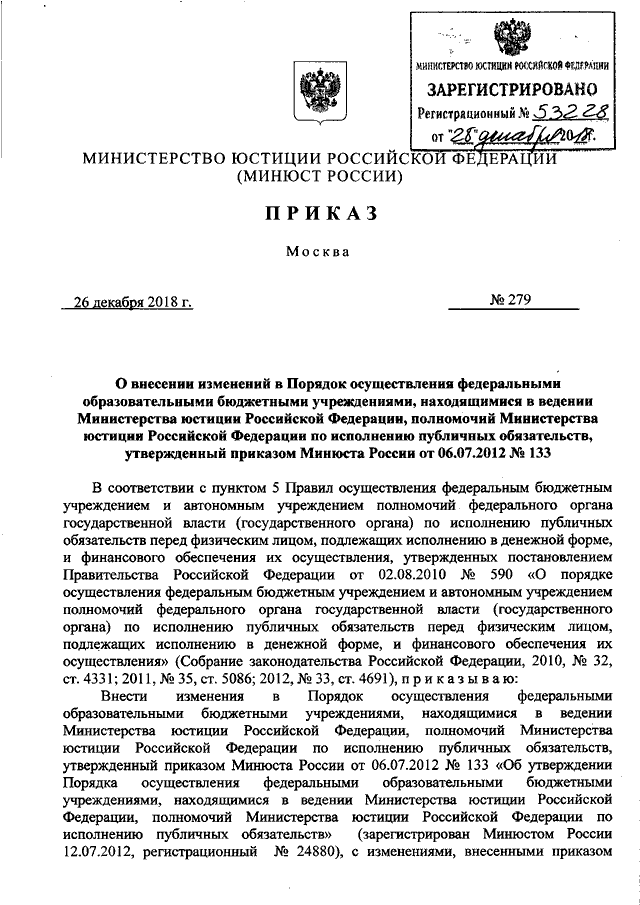 ПРИКАЗ Минюста РФ от 26.12.2018 N 279