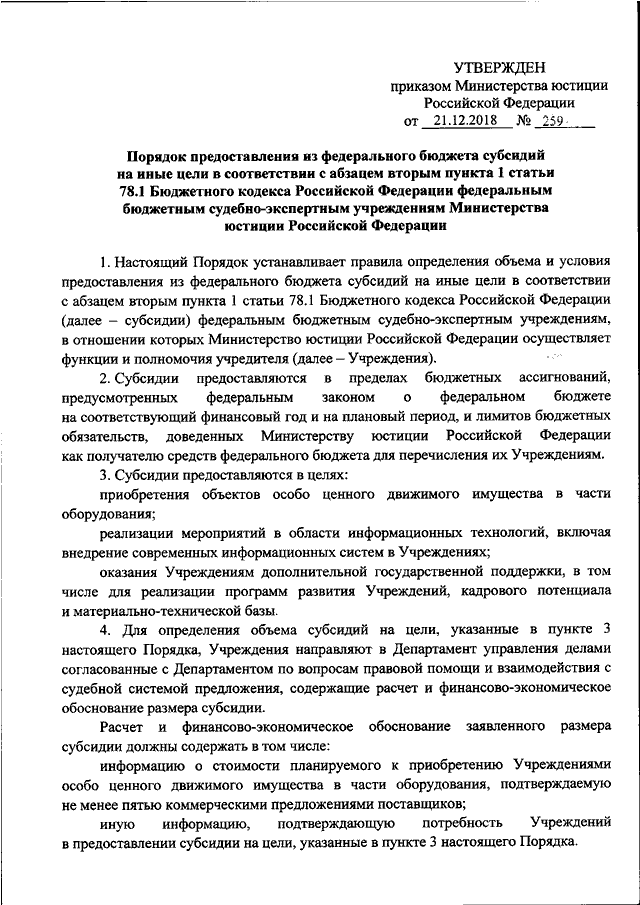 ПРИКАЗ Минюста РФ от 21.12.2018 N 259