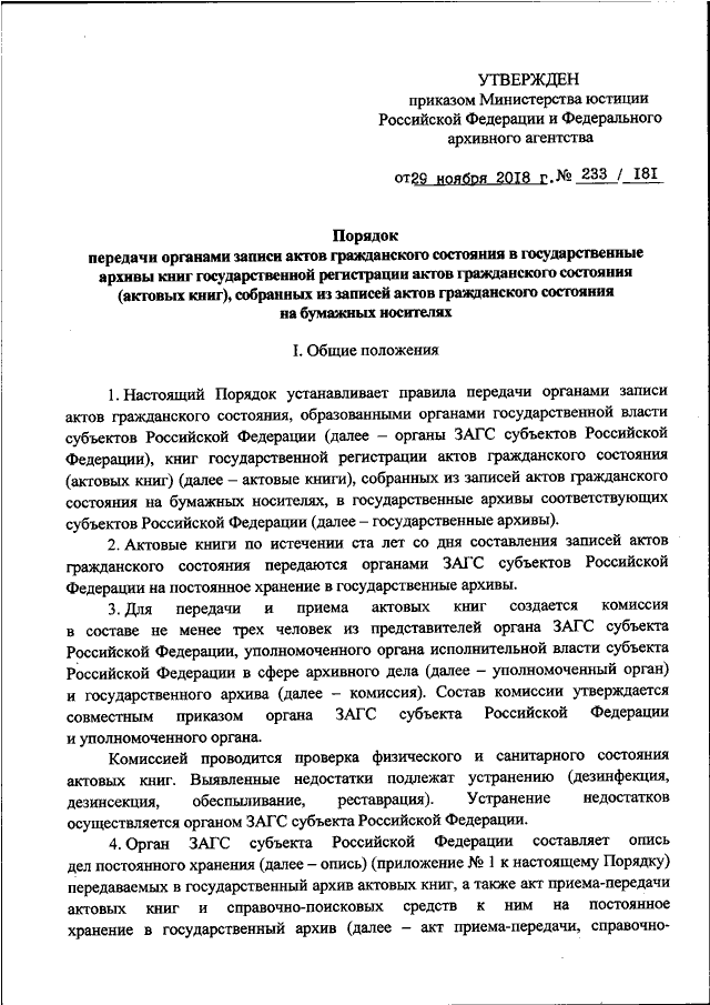 ПРИКАЗ Минюста РФ N 233, Росархива N 181 от 29.11.2018