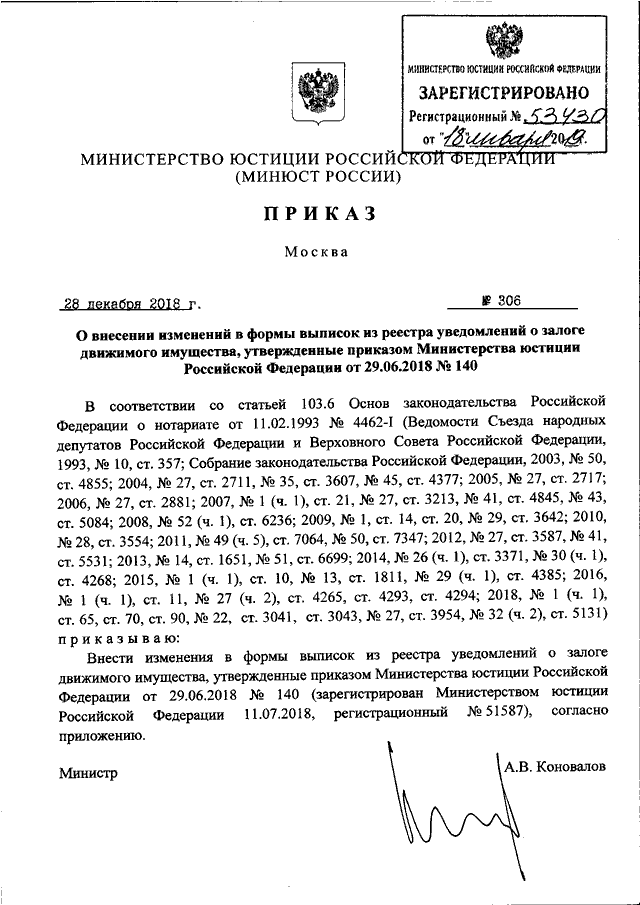 ПРИКАЗ Минюста РФ от 28.12.2018 N 306