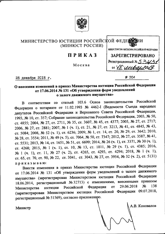 ПРИКАЗ Минюста РФ от 28.12.2018 N 304