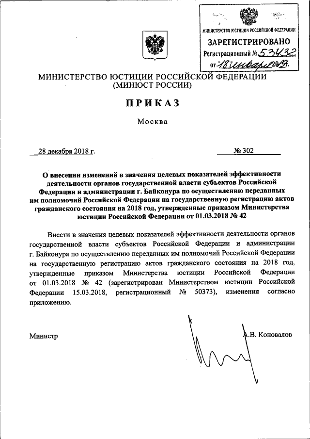 ПРИКАЗ Минюста РФ от 28.12.2018 N 302