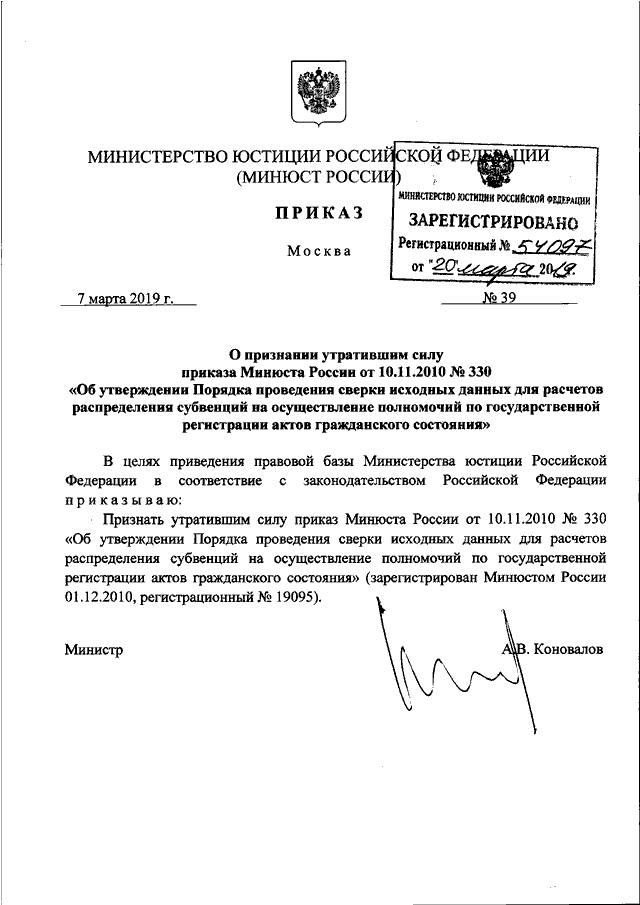 ПРИКАЗ Минюста РФ от 07.03.2019 N 39