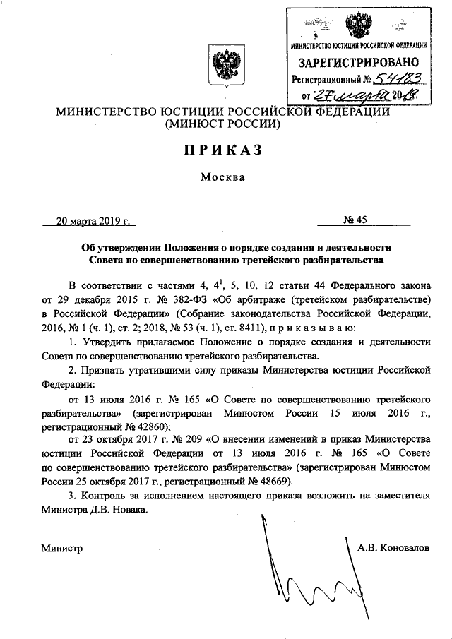 ПРИКАЗ Минюста РФ от 20.03.2019 N 45