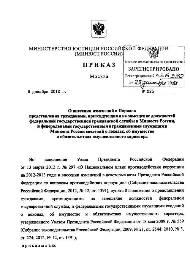 ПРИКАЗ Минюста РФ от 06.12.2012 N 225
