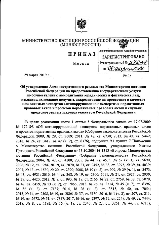 ПРИКАЗ Минюста РФ от 29.03.2019 N 57