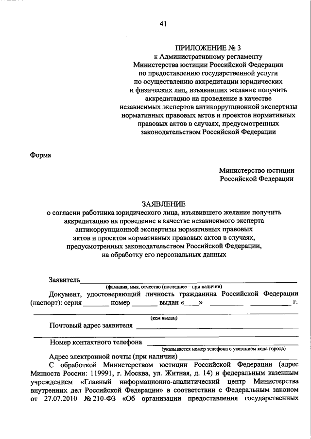 "ОБ УТВЕРЖДЕНИИ АДМИНИСТРАТИВНОГО РЕГЛАМЕНТА МИНИСТЕРСТВА ЮСТИЦИИ РОССИЙСКОЙ ФЕДЕРАЦИИ ПО ПРЕДОСТАВЛЕНИЮ ГОСУДАРСТВЕННОЙ УСЛУГИ ПО ОСУЩЕСТВЛЕНИЮ АККРЕДИТАЦИИ ЮРИДИЧЕСКИХ И ФИЗИЧЕСКИХ ЛИЦ, ИЗЪЯВИВШИХ ЖЕЛАНИЕ ПОЛУЧИТЬ АККРЕДИТАЦИЮ НА ПРОВЕДЕНИЕ В КАЧЕСТВЕ НЕЗАВИСИМЫХ ЭКСПЕРТОВ АНТИКОРРУПЦИОННОЙ ЭКСПЕРТИЗЫ НОРМАТИВНЫХ ПРАВОВЫХ АКТОВ И ПРОЕКТОВ НОРМАТИВНЫХ ПРАВОВЫХ АКТОВ В СЛУЧАЯХ, ПРЕДУСМОТРЕННЫХ ЗАКОНОДАТЕЛЬСТВОМ РОССИЙСКОЙ ФЕДЕРАЦИИ"