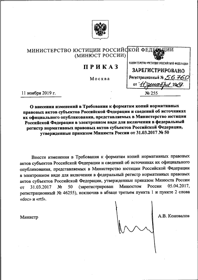 ПРИКАЗ Минюста РФ от 11.11.2019 N 255