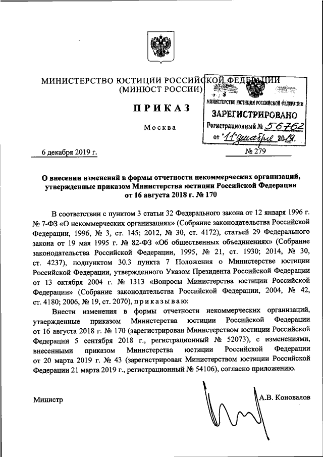 ПРИКАЗ Минюста РФ от 06.12.2019 N 279