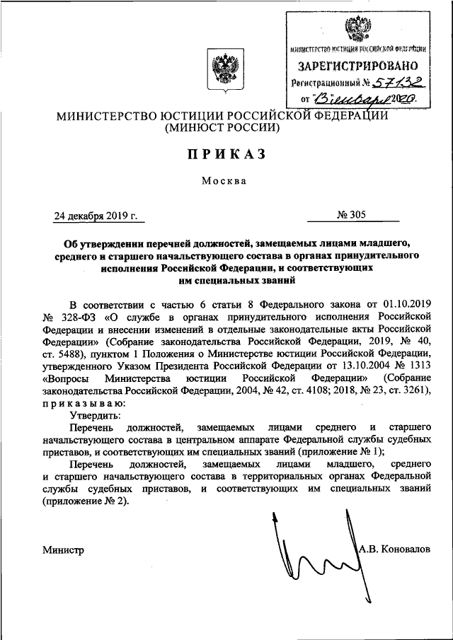 ПРИКАЗ Минюста РФ от 24.12.2019 N 305