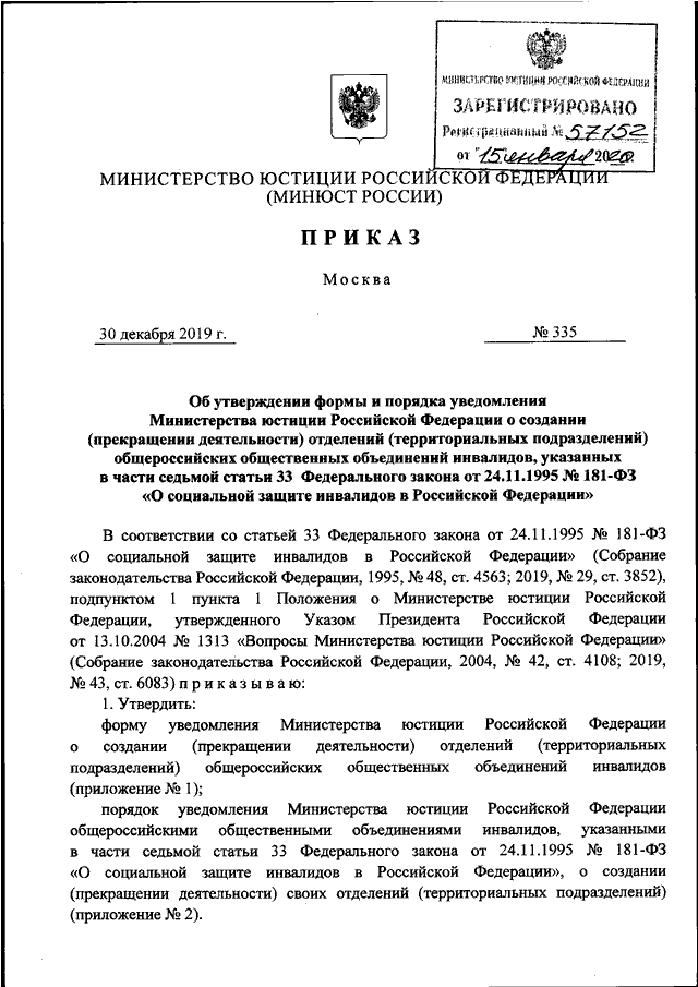 ПРИКАЗ Минюста РФ от 30.12.2019 N 335